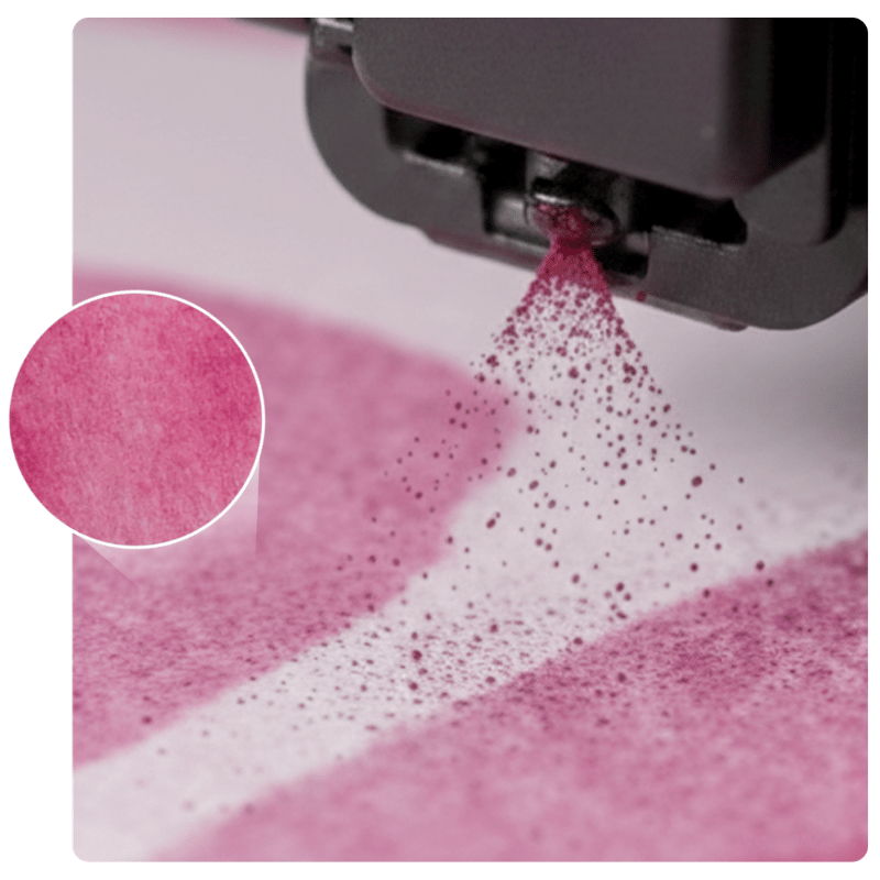 Tinte wird aufs Papier gesprüht, zieht sofort ein wie in einen Schwamm und verliert dabei ihre Leuchtkraft.