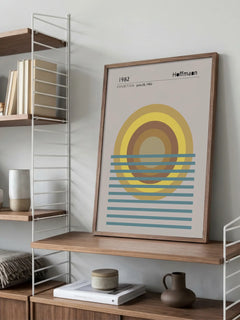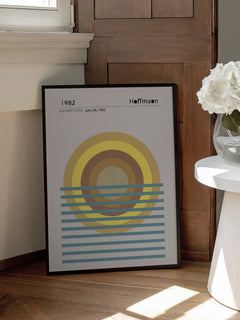 Dieses grafische Poster zeigt eine stilisierte Sonne in verschiedenen Gelbtönen, die über grünen Linien auf einem beigen Hintergrund schwebt. Der Text auf dem Poster lautet "1982 Exhibition June 28, 1982 Hoffmann" und verleiht dem Bild einen retro-künstlerischen Touch. Die Komposition verbindet geometrische Formen mit einer nostalgischen Anspielung auf eine Ausstellung aus dem Jahr 1982 und schafft so ein einzigartiges visuelles Erlebnis.