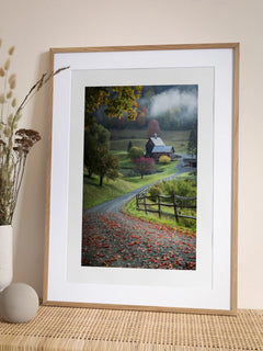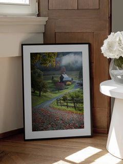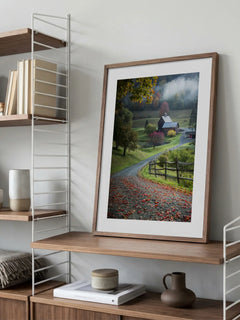 Dieses Poster zeigt eine malerische Herbstszene auf dem Land in Vermont. Im Mittelpunkt steht eine rustikale Scheune, umgeben von bunten Bäumen in leuchtenden Herbstfarben. Der Nebel, der über die Landschaft zieht, verleiht dem Bild eine mystische und beruhigende Atmosphäre. Der gewundene Weg und der Holzzaun im Vordergrund führen den Betrachter in die Tiefe der Szene und laden zum Träumen ein. Perfekt für alle, die eine gemütliche und entspannte Atmosphäre in ihrem Zuhause schaffen möchten.