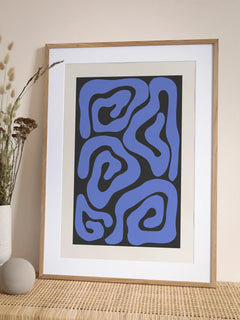 Dieses abstrakte Poster zeigt geschwungene blaue Linien auf einem tiefschwarzen Hintergrund. Die modernen und trendigen Farben machen es zu einem vielseitigen Kunstwerk, das sich nahtlos in jeden Raum einfügt. Perfekt für Liebhaber zeitgenössischer Kunst, die ihrem Zuhause einen Hauch von Stil und Eleganz verleihen möchten.