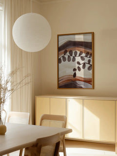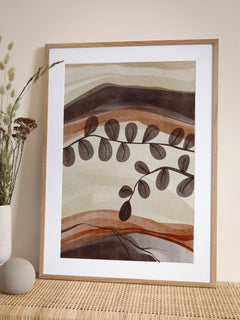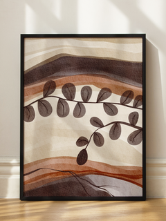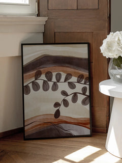 Dieses Poster zeigt eine künstlerische Darstellung eines abstrakten Zweigs mit braunen Blättern, die sich elegant über einen gestreiften Hintergrund in Beige- und Brauntönen erstrecken. Die harmonische Farbpalette und das sanfte Design schaffen eine beruhigende und entspannende Atmosphäre, die sich ideal für Wohnräume eignet, die eine ruhige und natürliche Ausstrahlung suchen.
