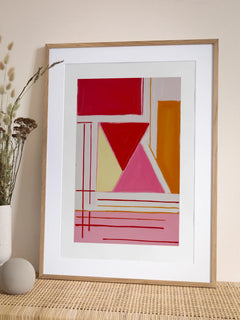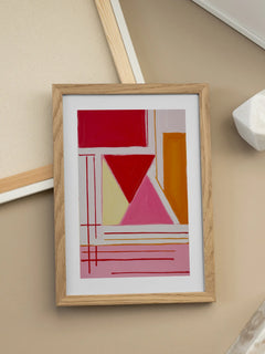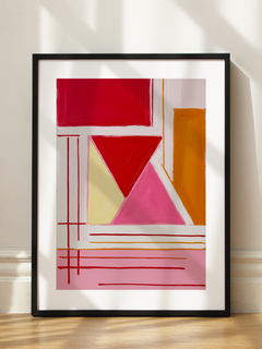 Dieses abstrakte Ölbild zeigt eine lebendige Komposition aus Formen und Linien in Rot, Pink und Orange. Die geometrischen Elemente und kräftigen Farben verleihen dem Kunstwerk eine dynamische und moderne Ausstrahlung. Perfekt, um jedem Raum eine lebendige und kreative Atmosphäre zu verleihen.