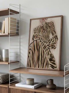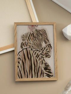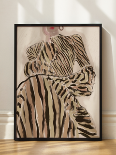 Diese Illustration zeigt eine stilvolle Frau in einem gestreiften Kleid auf einem beigen Hintergrund. Die modernen und trendigen Farben machen dieses Poster zu einer perfekten Ergänzung für das Wohnzimmer oder Schlafzimmer. Das Design vermittelt ein Gefühl von Eleganz und Modebewusstsein und ist ideal für Liebhaber zeitgenössischer Kunst.