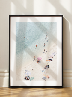 Dieses Poster zeigt eine luftige Fotografie eines Strandes mit feinem weißen Sand und kristallklarem Wasser. Menschen genießen den sonnigen Tag, schwimmen im Meer und entspannen sich unter bunten Sonnenschirmen. Diese Szene bringt eine erfrischende Sommerstimmung in dein Zuhause und lädt zum Träumen von Urlaub und Entspannung ein.