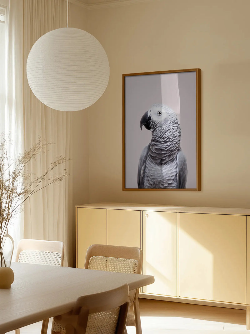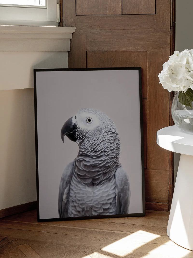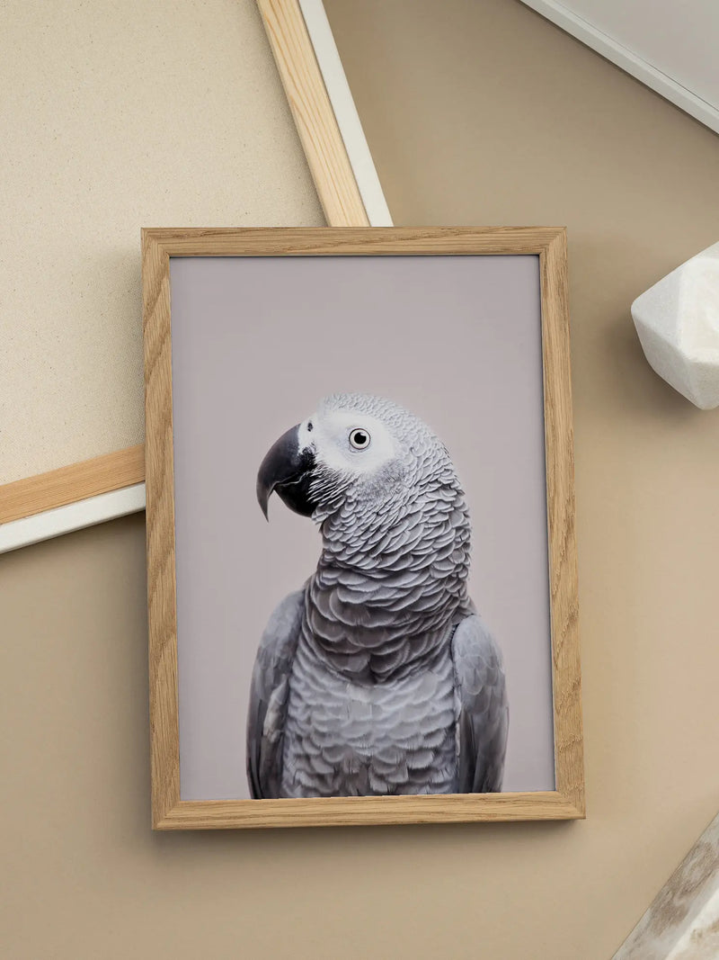 Dieses Poster zeigt einen afrikanischen Graupapagei in einem eleganten und detaillierten Porträt. Der Papagei ist in einem sanften Licht eingefangen, das seine feinen grauen Federn und den charakteristischen schwarzen Schnabel hervorhebt. Der Hintergrund ist schlicht gehalten, um die Schönheit und Anmut des Vogels in den Vordergrund zu stellen. Dieses Kunstwerk ist perfekt für Tierliebhaber und verleiht jedem Raum einen Hauch von Exotik und Eleganz.