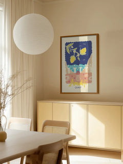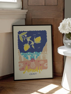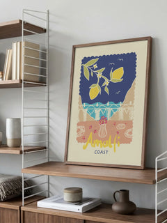 Dieses Poster zeigt eine grafische Illustration der Amalfiküste mit Zitronen im Vordergrund. Die leuchtenden Farben und das sommerliche Design vermitteln ein Gefühl von Frische und Urlaubsstimmung. Die Küstenlandschaft im Hintergrund ergänzt die lebendige Darstellung der Zitronen und schafft eine harmonische Komposition, die perfekt für jeden Raum geeignet ist, der einen Hauch von mediterranem Flair benötigt.