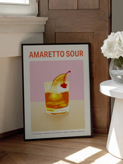 Dieses Poster zeigt einen Amaretto Sour Cocktail in einem klaren Glas, dekoriert mit einer Orangenscheibe und einer Maraschino-Kirsche. Die Zutaten für diesen klassischen Cocktail sind in kleiner Schrift unter dem Glas aufgeführt: Amaretto, Zuckersirup, frischer Zitronensaft, Eiweiß, Orangenscheibe und eine Maraschino-Kirsche. Der Hintergrund ist in sanften Pastelltönen gehalten, was dem Bild eine moderne und stilvolle Note verleiht. Perfekt für Cocktail-Liebhaber und als dekoratives Element in einer Küche oder Bar.