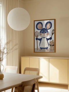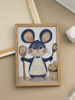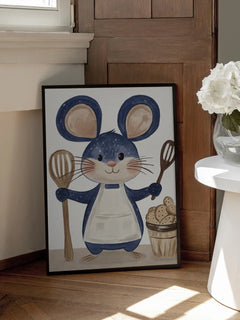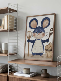 Diese bezaubernde Illustration zeigt eine blaue Maus in einer weißen Schürze, die zwei Schneebesen hält. Neben ihr steht ein Korb voller Kekse. Die fröhliche Szene ist ideal für die Dekoration eines Kinderzimmers und bringt eine verspielte und kreative Atmosphäre in den Raum.