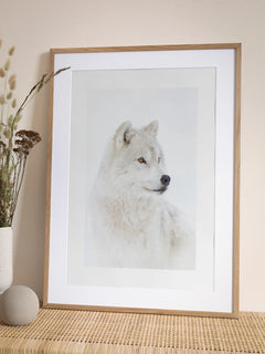 Dieses beeindruckende Poster zeigt die Fotografie eines weißen Wolfes mit durchdringenden gelben Augen vor einem hellgrauen Hintergrund. Die detaillierte Darstellung des Wolfes bringt einen modernen und zugleich natürlichen Look in dein Zuhause. Perfekt für Tierliebhaber und alle, die eine elegante und kraftvolle Atmosphäre schaffen möchten.