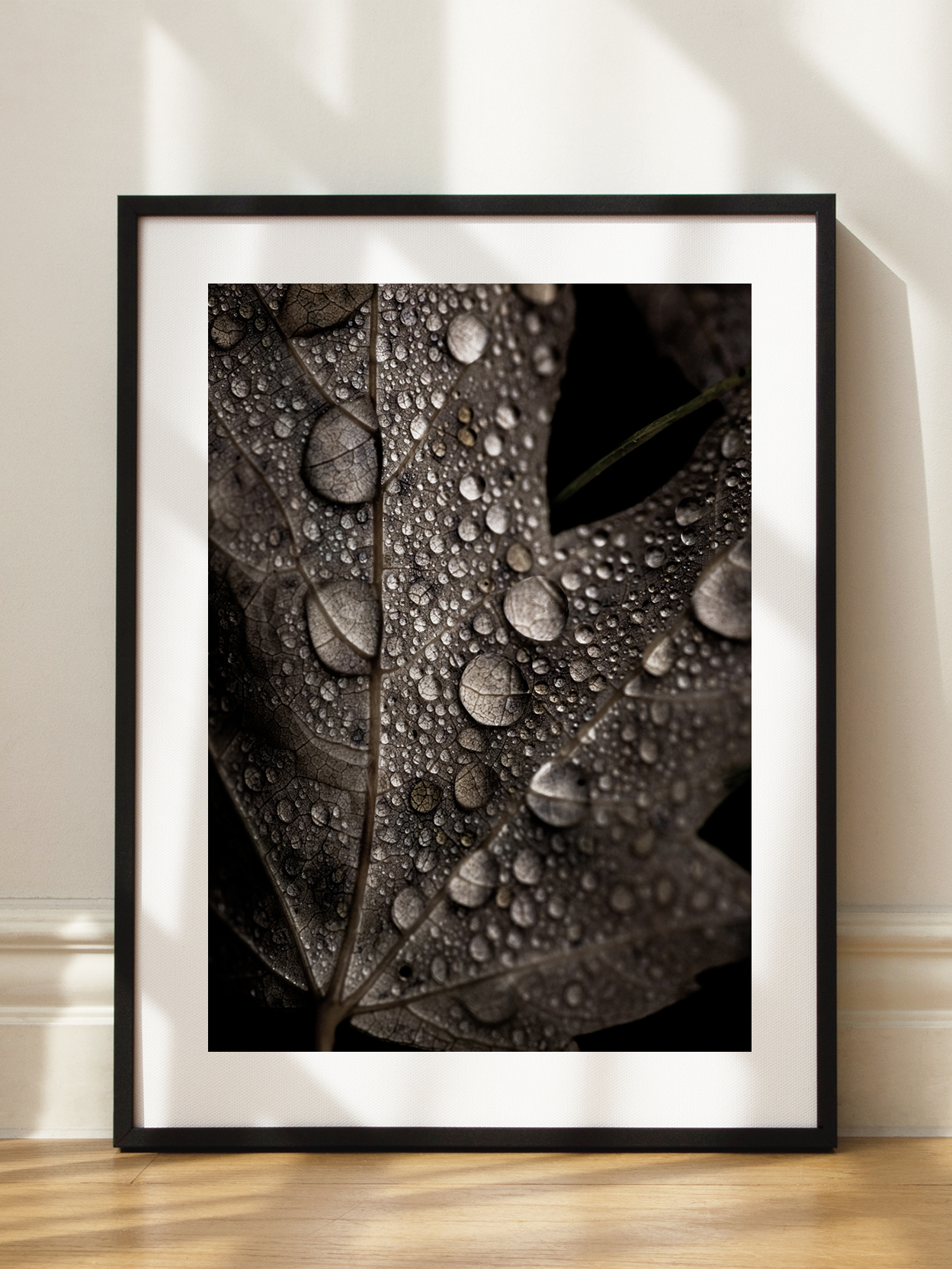 Dieses beeindruckende Poster zeigt eine Nahaufnahme eines braunen Blattes, das mit Wassertropfen bedeckt ist. Die feinen Details der Blattstruktur und die glänzenden Tropfen schaffen eine faszinierende und beruhigende Komposition. Perfekt, um die Schönheit der Natur in dein Zuhause zu bringen und eine herbstliche Atmosphäre zu schaffen.