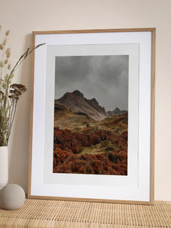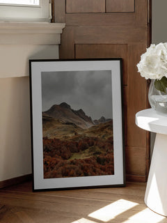 Ein Fotoposter, das eine herbstliche Berglandschaft in Braun- und Rottönen zeigt. Es fängt die ruhige und stille Atmosphäre der Natur ein. Die majestätischen Berge im Hintergrund und die farbenfrohen Bäume im Vordergrund schaffen ein harmonisches Bild, das die Schönheit der Herbstsaison widerspiegelt. Perfekt für Naturliebhaber und alle, die die Ruhe der Berge schätzen.