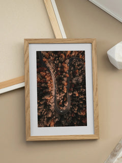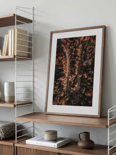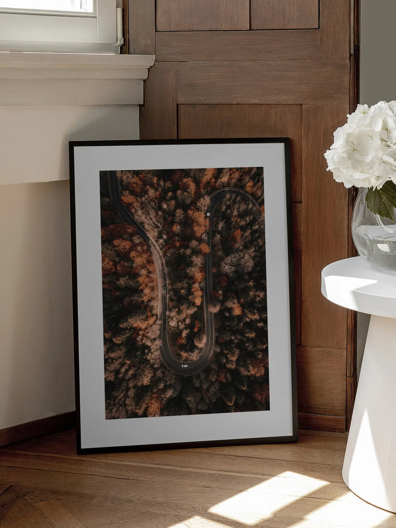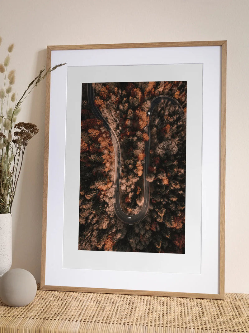 Diese beeindruckende Fotografie zeigt einen Wald in herbstlichen Farben, durch den sich eine kurvenreiche Straße schlängelt. Die warmen Töne der Blätter schaffen eine einladende und gemütliche Atmosphäre, die perfekt ist, um einen Hauch von Herbst in Ihr Zuhause zu bringen. Die Luftaufnahme bietet eine einzigartige Perspektive auf die natürliche Schönheit der Landschaft.