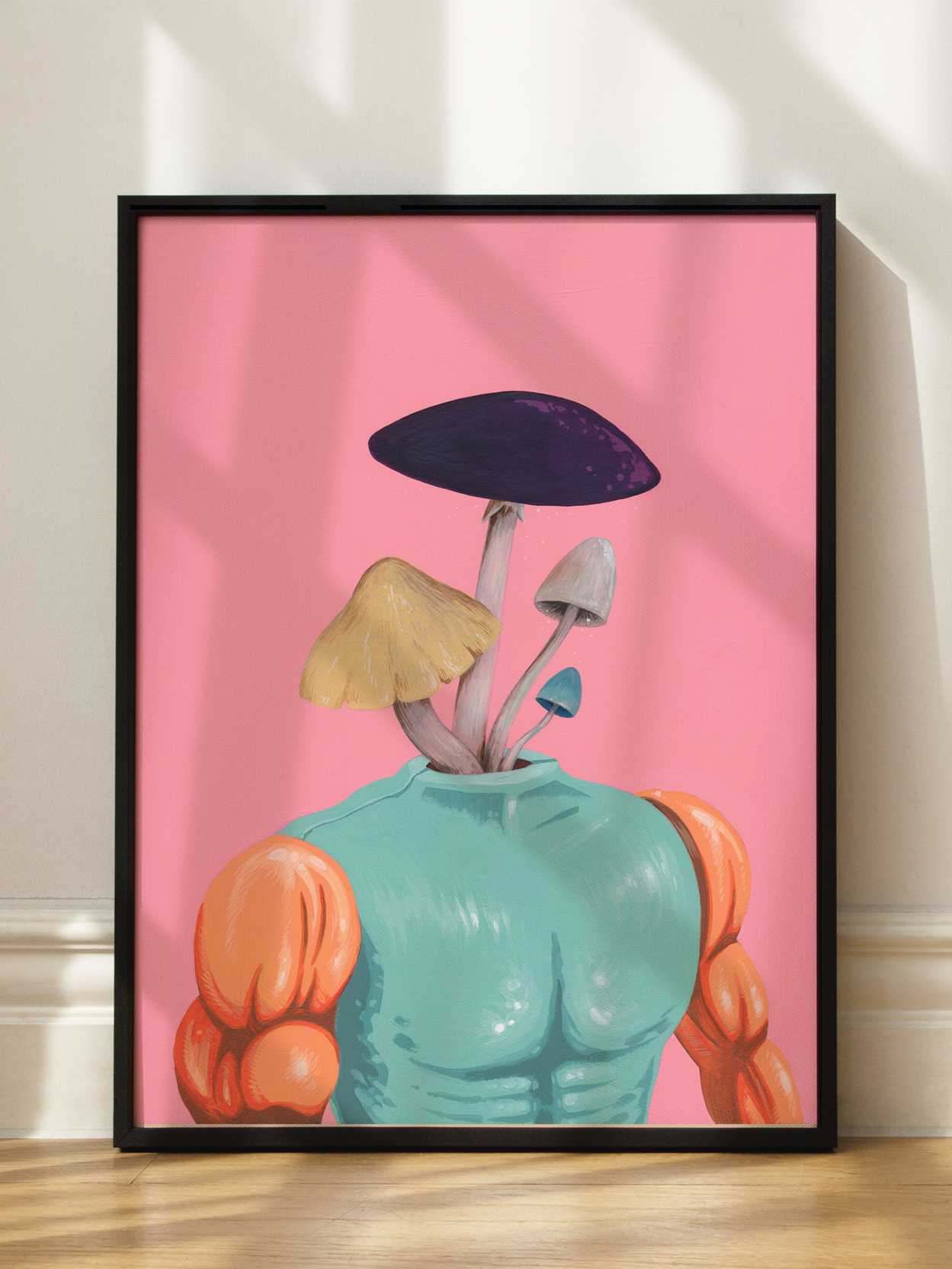 Dieses faszinierende Poster zeigt einen muskulösen Körper, dessen Kopf durch ein Bündel farbenfroher Pilze ersetzt wurde. Der Körper ist in sanften Pastellfarben gehalten, während der Hintergrund in einem lebendigen Rosa erstrahlt. Diese einzigartige und auffällige Komposition zieht garantiert alle Blicke auf sich und verleiht jedem Raum einen Hauch von surrealer Kunst.