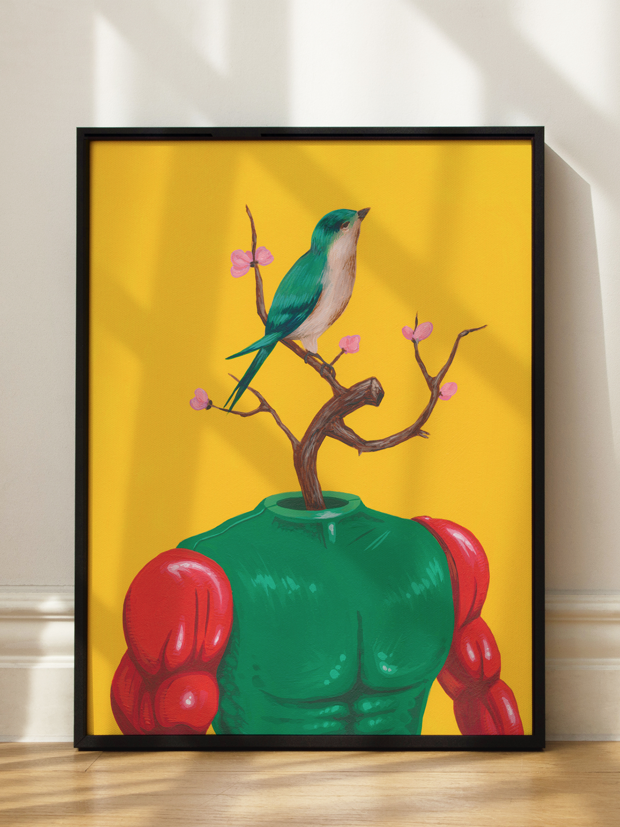 Tauche ein in die Welt des Surrealismus mit diesem faszinierenden Poster. Ein blauer Vogel sitzt auf einem blühenden Ast, der aus einem muskulösen, kopflosen Körper wächst, vor einem leuchtend gelben Hintergrund. Dieses Kunstwerk ist perfekt für alle, die einen Hauch von Verspieltheit in ihre Einrichtung bringen möchten.