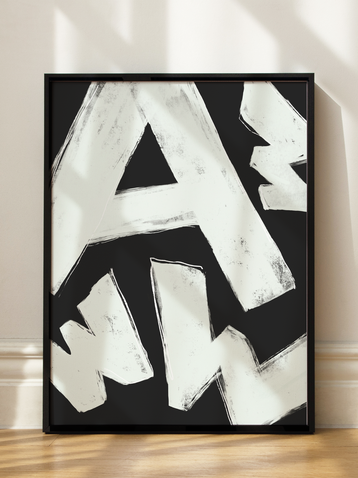 Dieses Schwarz-Weiß-Typografieposter zeigt den Buchstaben A in einem markanten, handgemalten Stil. Der weiße Buchstabe hebt sich kraftvoll vom schwarzen Hintergrund ab und verleiht dem Design eine moderne und minimalistische Ästhetik. Perfekt für ein zeitgenössisches Zuhause, bringt dieses Poster einen Hauch von Stil und Eleganz in jeden Raum.
