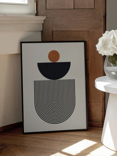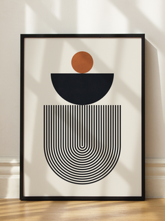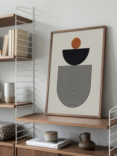 Geometrische Komposition aus Kreis, Halbkreis und linearen Mustern in warmen Erdtönen. Funktioniert besonders gut über Sideboards oder als Akzent hinter dem Schreibtisch. Setzt einen modernen Fokus in klaren Einrichtungsstilen.