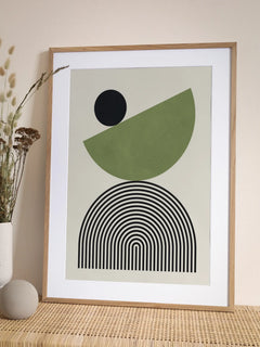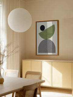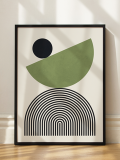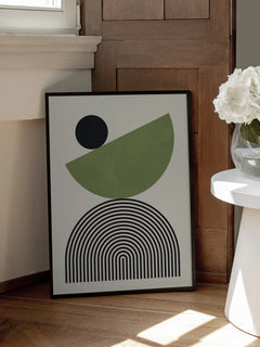 Geometrische Komposition mit schwarzem Kreis, grünem Halbkreis und gestreiftem Regenbogen auf beigem Grund. Funktioniert besonders gut über modernen Möbeln. Setzt einen ruhigen Akzent in minimalistisch eingerichteten Räumen.