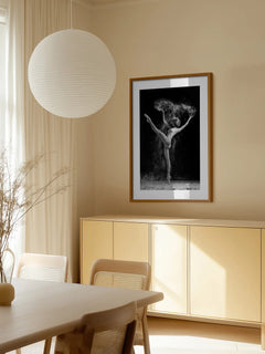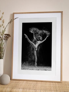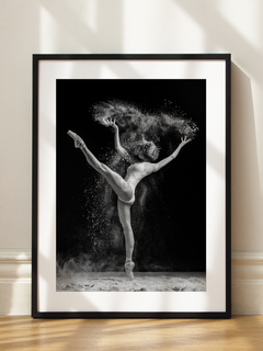 Diese beeindruckende Schwarz-Weiß-Fotografie zeigt eine Ballerina, die anmutig auf einem Bein steht, umgeben von einer Wolke aus Mehl. Die dynamische Bewegung und der Kontrast zwischen dem dunklen Hintergrund und dem hellen Mehl verleihen dem Bild eine dramatische und künstlerische Note. Perfekt für Schlafzimmer oder Wohnzimmer, bringt dieses Poster Eleganz und eine künstlerische Atmosphäre in jeden Raum.