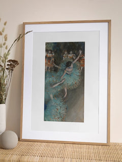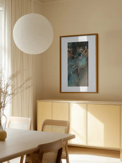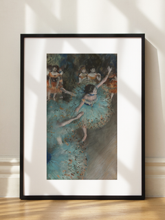 Ein klassisches Kunstposter, das Balletttänzer in blauen Kostümen während einer Probe zeigt. Die Tänzer sind in dynamischen Posen eingefangen, was die Eleganz und Anmut des Balletts betont. Die sanften Blautöne der Kostüme kontrastieren mit den warmen Farben des Hintergrunds und schaffen eine harmonische Komposition. Dieses Poster eignet sich perfekt für eine Bilderwand im Vintage-Stil und bringt künstlerische Raffinesse in jeden Raum.