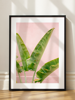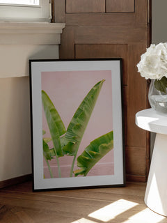 Dieses Poster zeigt eine Fotografie von grünen Bananenblättern vor einem zarten rosa Hintergrund. Die lebendigen Grüntöne der Blätter kontrastieren wunderschön mit dem sanften Rosa, was eine frische und tropische Atmosphäre schafft. Perfekt, um jedem Raum einen Hauch von Natur und Farbe zu verleihen.