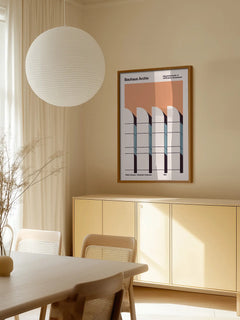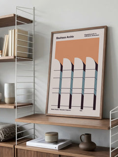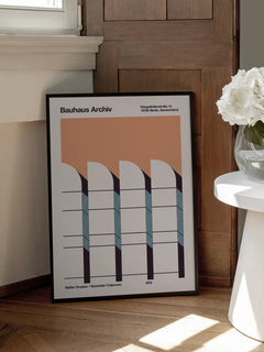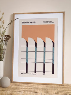 Diese grafische Illustration zeigt das Bauhaus Archiv in Berlin, hervorgehoben durch ein auffälliges orangefarbenes Quadrat im Hintergrund. Das Design kombiniert klare Linien und geometrische Formen, die den ikonischen Stil des Bauhauses widerspiegeln. Ein Muss für Architekturbegeisterte, bringt dieses Poster einen Hauch von modernistischer Eleganz in jeden Raum.