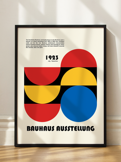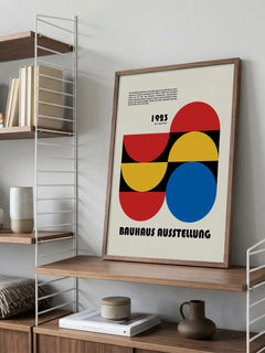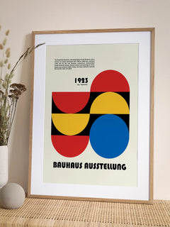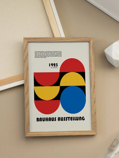 Dieses Poster zeigt ein klassisches Bauhaus-Design mit geometrischen Formen in Rot, Gelb und Blau auf einem beigen Hintergrund. Der schwarze Text "Bauhaus Ausstellung" und das Jahr 1923 verleihen dem Bild einen historischen und künstlerischen Wert. Ein zeitloses Kunstwerk, das die Essenz der Bauhaus-Bewegung einfängt und in jedem Raum ein stilvolles Statement setzt.