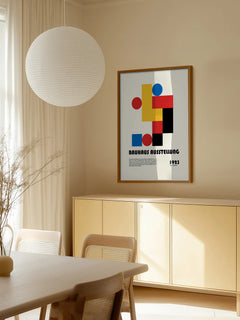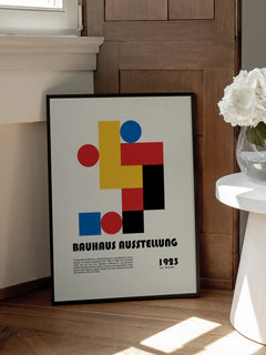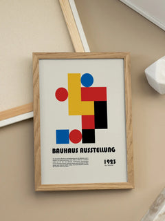 Dieses Poster zeigt eine Grafik mit typischen Bauhaus-Formen in den Farben Rot, Gelb, Schwarz und Blau auf einem beigen Hintergrund. Unter der Grafik befindet sich schwarzer Text, der das Thema und die Zeit der Ausstellung beschreibt. Das farbenfrohe Design ist eine perfekte Ergänzung für moderne Wohnräume und spiegelt den ikonischen Stil der Bauhaus-Bewegung wider.