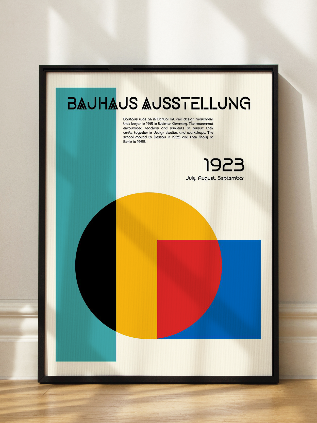 Dieses Poster ist eine Neuinterpretation des berühmten Bauhaus-Ausstellungsposters von 1923. Es zeigt geometrische Formen in kräftigen Farben und enthält Informationen über die Geschichte des Bauhauses, das 1919 in Weimar, Deutschland, gegründet wurde und 1923 nach Berlin zog. Die klare und minimalistische Gestaltung spiegelt die Prinzipien der Bauhaus-Bewegung wider, die Kunst und Handwerk vereinte und die moderne Designwelt nachhaltig beeinflusste.