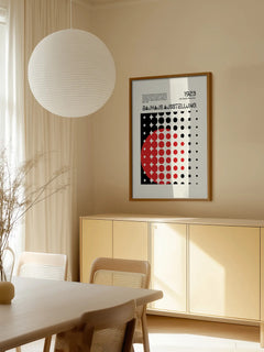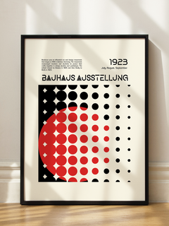 Dieses Poster zeigt ein auffälliges Muster aus roten und schwarzen Punkten, das einen Halbkreis bildet. Es trägt den Titel "Bauhaus Ausstellung" und das Datum "1923". Ein informativer Text beschreibt die Bauhaus-Bewegung, die 1919 in Weimar, Deutschland, begann, 1925 nach Dessau und schließlich 1932 nach Berlin zog. Das Design spiegelt die charakteristische Ästhetik der Bauhaus-Bewegung wider, die sich durch klare Formen und eine funktionale Gestaltung auszeichnet.