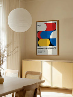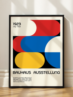 Dieses Poster zeigt ein grafisches Design im Bauhaus-Stil mit der Aufschrift „Bauhaus Ausstellung“. Die geometrischen Formen in Rot, Blau, Gelb und Schwarz sind charakteristisch für die Bauhaus-Bewegung und verleihen dem Bild eine moderne und künstlerische Ausstrahlung. Das Poster ist eine Hommage an die berühmte Bauhaus-Ausstellung von 1923 und ist ideal für Kunst- und Designliebhaber.