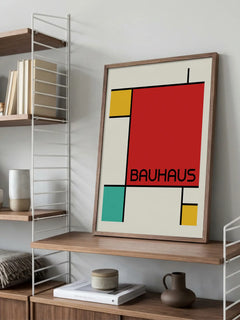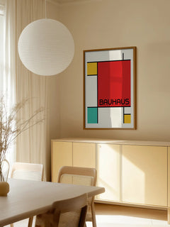 Dieses Poster zeigt eine grafische Illustration im Bauhaus-Stil mit farbigen Quadraten auf einem beigen Hintergrund. Im roten Quadrat steht der Text "Bauhaus". Die Komposition aus kräftigen Farben und klaren Linien verleiht jedem Raum einen modernen und künstlerischen Touch. Perfekt für Liebhaber des minimalistischen Designs und der modernen Kunst.