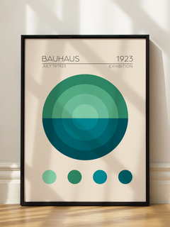 Dieses Poster zeigt eine Grafik im Bauhaus-Stil mit einem großen grünen Kreis und vier kleineren Kreisen darunter auf einem beigen Hintergrund. Der Text "Bauhaus 1923" verleiht dem Design einen historischen und künstlerischen Touch. Diese Grafikkunst mit Vintage-Elementen ist ideal für moderne Wohnräume und bringt einen Hauch von Geschichte und Design in Ihr Zuhause.