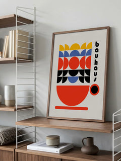 Dieses Poster zeigt eine grafische Illustration einer Vase in Rot, die mit geometrischen Formen in Blau, Gelb, Schwarz und Rot gefüllt ist. Der Hintergrund ist hellbeige, und daneben steht das Wort "Bauhaus". Dieses farbenfrohe Kunstwerk bringt einen modernen und stilvollen Touch in dein Zuhause und ist perfekt für Liebhaber des Bauhaus-Stils.