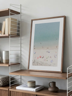 Diese Fotografie zeigt eine lebendige Strandszene aus der Vogelperspektive. Menschen schwimmen im klaren blauen Wasser und entspannen sich auf bunten Handtüchern und unter farbenfrohen Sonnenschirmen am Sandstrand. Die Komposition vermittelt ein Gefühl von Sommer, Freiheit und Entspannung und ist ideal, um ein sommerliches Ambiente in dein Zuhause zu bringen.