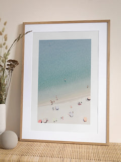 Dieses sommerliche Poster zeigt eine Luftaufnahme eines Strandes mit bunten Sonnenschirmen und Menschen, die im klaren blauen Wasser schwimmen. Die sanften Farben und die entspannte Atmosphäre fangen die Essenz eines perfekten Strandtages ein und bringen ein Gefühl von Ruhe und Erholung in jeden Raum.