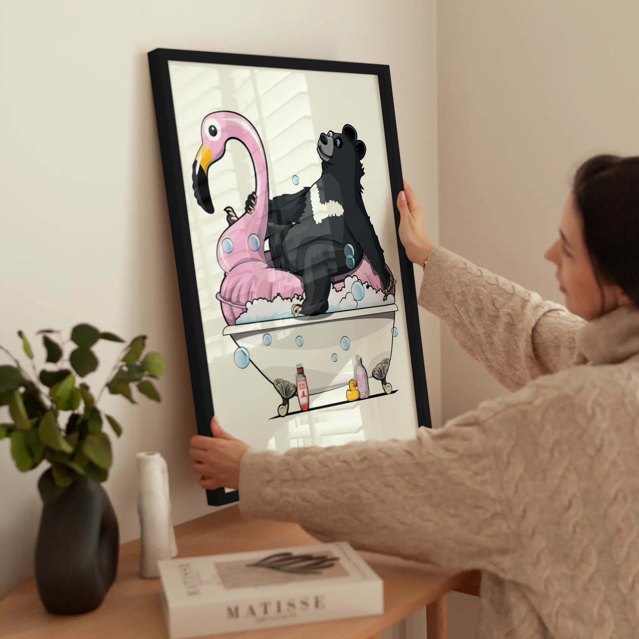Dieses verspielte Poster zeigt einen Bären, der entspannt in einer Badewanne sitzt, während er auf einem rosa Flamingo-Schwimmring balanciert. Umgeben von Seifenblasen und Badeutensilien, strahlt das Bild eine fröhliche und humorvolle Atmosphäre aus. Perfekt, um jedem Raum eine heitere und einzigartige Note zu verleihen.