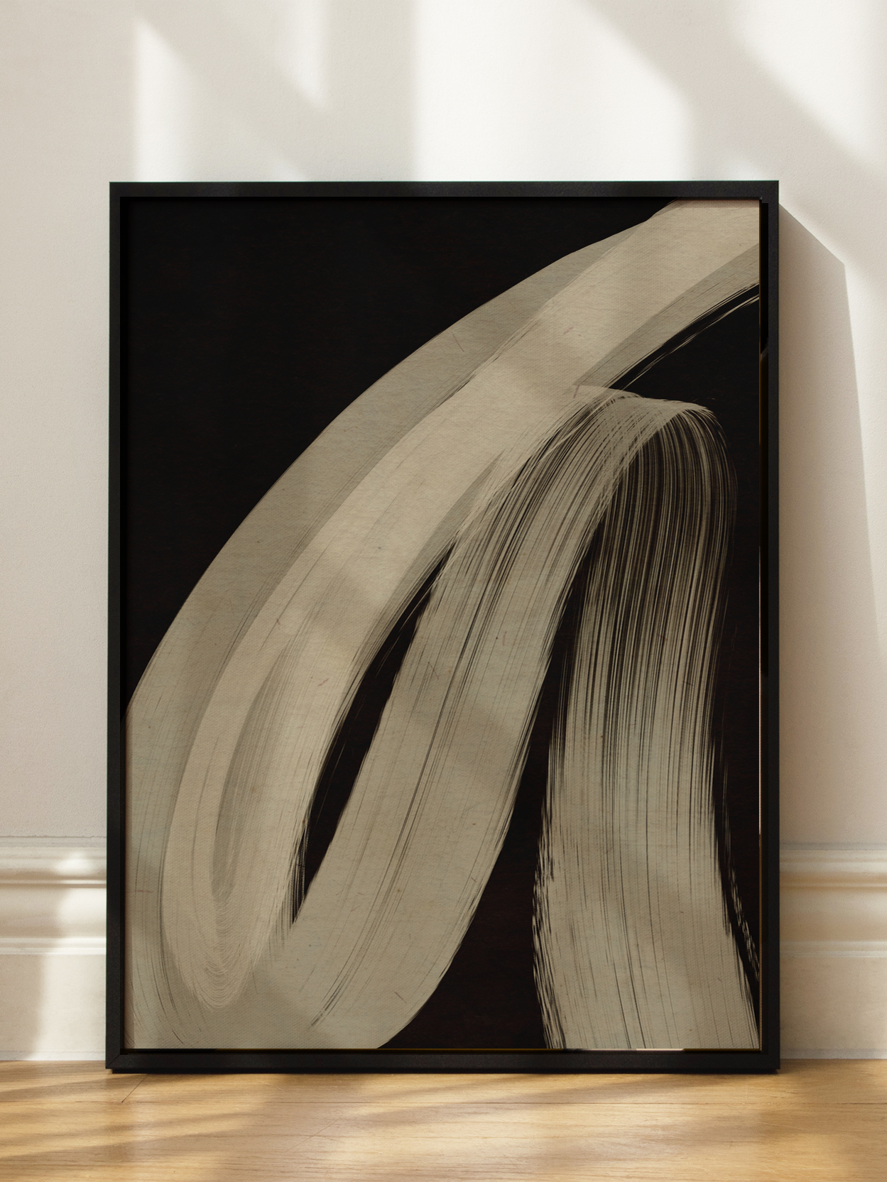 Grafische Illustration mit einem breiten, beigen Pinselstrich auf schwarzem Hintergrund. Dieses abstrakte Poster ist perfekt für ein minimalistisches Zuhause, in dem du einen modernen Look kreieren möchtest.