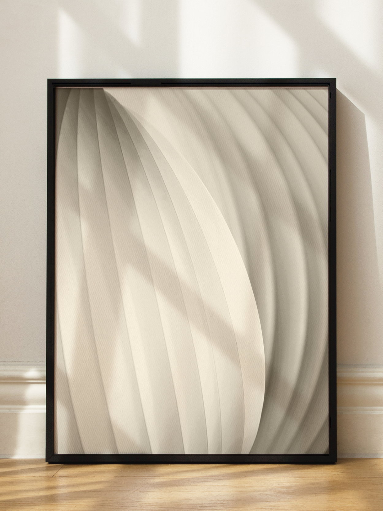 Dieses Poster zeigt eine Nahaufnahme von beigen, geschwungenen Linien, die ein harmonisches und beruhigendes Muster bilden. Die weichen Kurven und die monochrome Farbgebung verleihen dem Bild eine elegante und zeitlose Ästhetik. Perfekt für moderne und minimalistische Einrichtungen, bringt es Ruhe und Stil in jeden Raum.