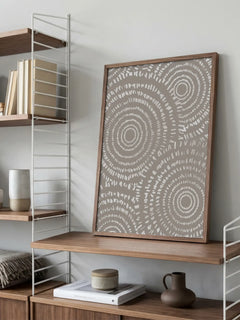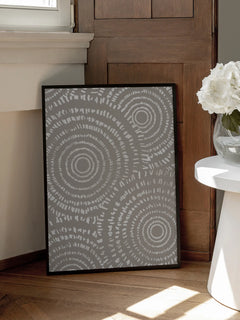 Organische Kreismuster in warmen Beigetönen schaffen eine ruhige Atmosphäre. Das geometrische Design mit handgezeichneten Elementen ergänzt natürliche Materialien perfekt. Ein zeitloser Akzent für moderne und boho-inspirierte Räume.