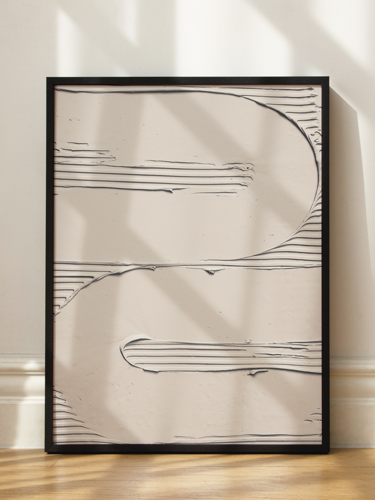 Ein Poster von beigem Gips mit einem wellenförmigen Muster. Die neutrale Farbpalette und das wellenförmige Muster schaffen ein Gefühl von Ruhe. Hänge es in dein Wohnzimmer oder Schlafzimmer, um eine ruhige und entspannende Atmosphäre zu schaffen.