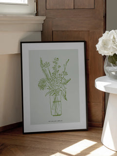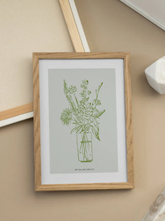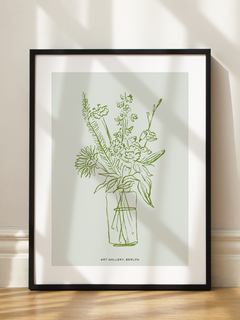 Line Art Zeichnung eines Blumenstraußes in einer Glasvase mit dem Schriftzug Art Gallery Berlin. Die grünen Linien auf beigem Grund ergänzen moderne und skandinavische Einrichtung. Funktioniert besonders gut über dem Sofa oder der Kommode.