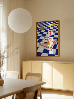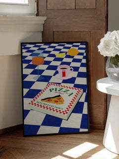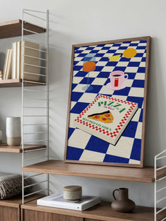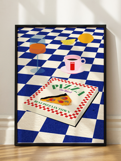 Dieses lebendige Poster zeigt eine Pizza-Schachtel mit der Aufschrift „Best Pizza in Town“ auf einem blau-weiß karierten Tisch. Neben der Schachtel stehen ein Glas mit Getränk und eine Tasse Kaffee, sowie eine Zitronenscheibe und eine Orange. Die kräftigen Farben und das verspielte Design machen es ideal für Küchen oder Esszimmer, die eine fröhliche und einladende Atmosphäre ausstrahlen sollen.