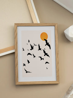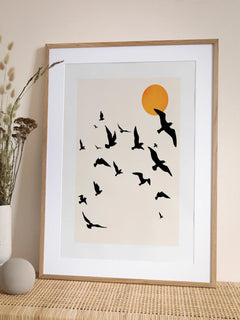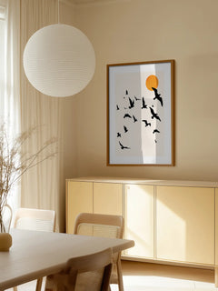 Dieses Poster zeigt eine grafische Illustration von schwarzen Vögeln, die vor einem hellbeigen Hintergrund fliegen, mit einer leuchtend orangefarbenen Sonne im oberen Bereich. Die Komposition vermittelt ein Gefühl von Freiheit und Bewegung und bringt einen modernen und stilvollen Look in dein Zuhause. Perfekt, um jedem Raum eine dynamische und künstlerische Note zu verleihen.