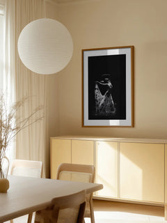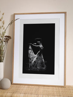 Diese beeindruckende Schwarz-Weiß-Fotografie zeigt eine Balletttänzerin in einem eleganten, langen Kleid mit Blumenmuster. Die Tänzerin ist in einer anmutigen Pose eingefangen, die ihre Eleganz und Anmut unterstreicht. Die kontrastreiche Beleuchtung hebt die Details des Kleides und die geschmeidigen Bewegungen der Tänzerin hervor. Dieses Kunstwerk ist ideal, um in einem Wohnzimmer oder Schlafzimmer eine Atmosphäre von Eleganz und Ruhe zu schaffen.