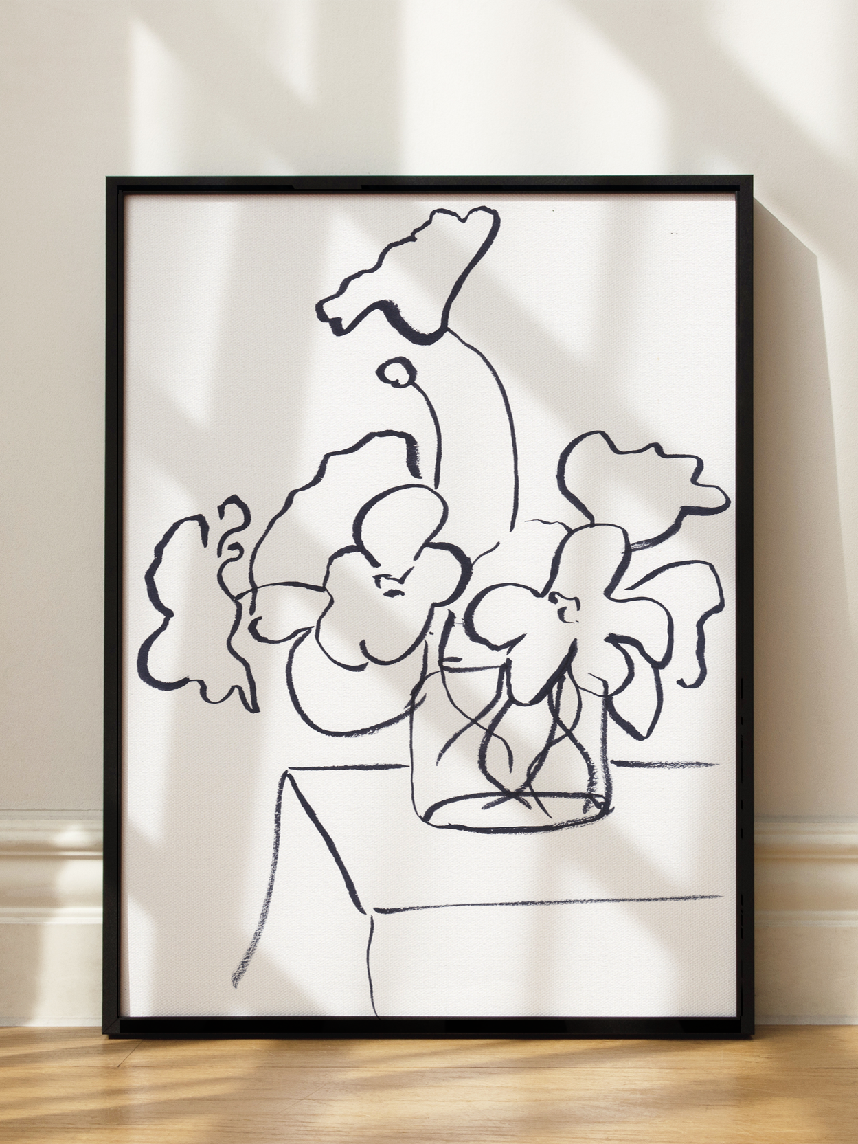 Dieses Poster zeigt eine minimalistische Schwarzweiß-Illustration eines Blumenstraußes. Die klaren Linien und die schlichte Darstellung verleihen dem Bild einen modernen und eleganten Look. Perfekt geeignet, um in jedem Raum eine stilvolle und zeitlose Atmosphäre zu schaffen.