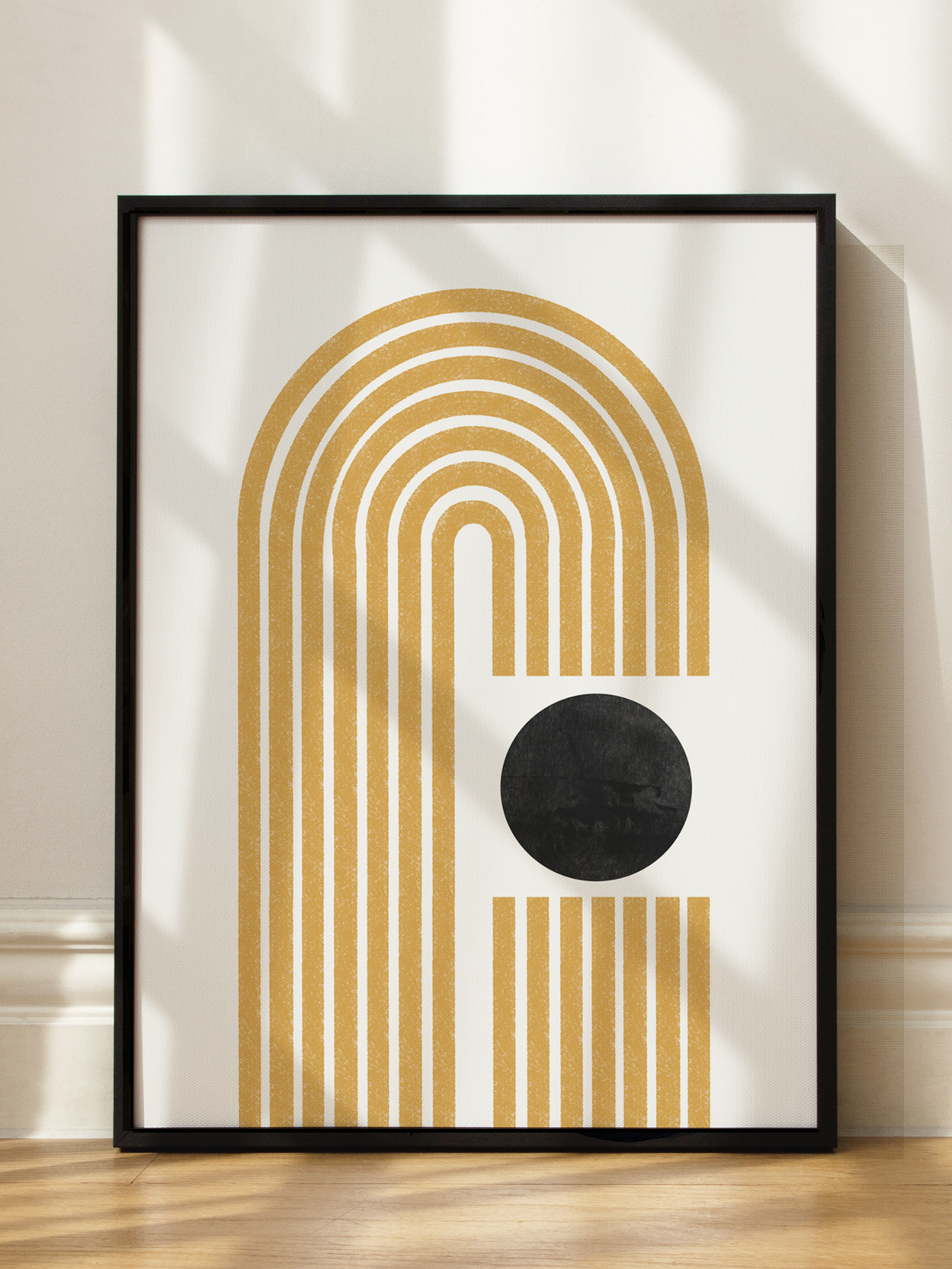 Dieses Poster zeigt eine stilvolle grafische Darstellung mit einer schwarzen Kugel und einem Bogen aus gelben Linien auf einem grauen Hintergrund. Die minimalistische Komposition verleiht jedem Raum einen modernen und frischen Look. Perfekt für Liebhaber von zeitgenössischem Design, die ihrem Zuhause eine elegante Note verleihen möchten.