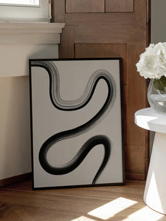 Dieses elegante Poster zeigt eine schwarze, geschwungene Linie auf einem beigen Hintergrund. Die fließende Bewegung der Linie verleiht dem Bild eine dynamische und zugleich beruhigende Wirkung. Perfekt geeignet, um in deinem Wohnzimmer einen modernen und stilvollen Akzent zu setzen.