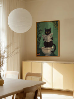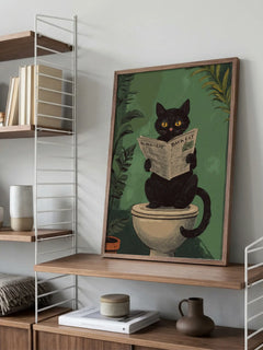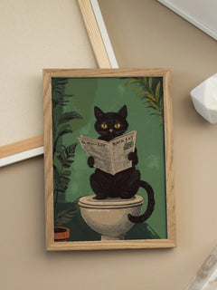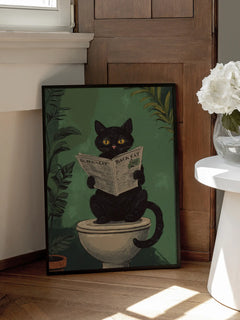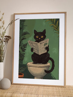 Dieses humorvolle Poster zeigt eine schwarze Katze, die auf der Toilette sitzt und eine Zeitung liest. Der Hintergrund ist grün und von Pflanzen umgeben, was eine entspannte und verspielte Atmosphäre schafft. Perfekt für Katzenliebhaber und ideal für das Badezimmer geeignet, bringt dieses Bild einen Hauch von Spaß und Originalität in jeden Raum.