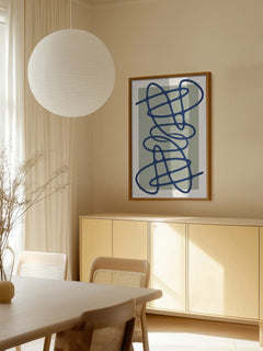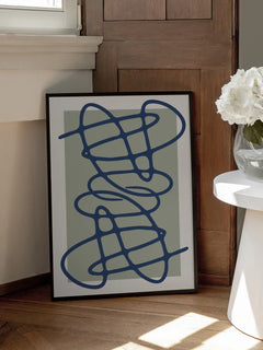 Ein moderner abstrakter Kunstdruck, der ein hellgrünes Quadrat mit dunkelblauen, geschwungenen Linien kombiniert. Die dynamische Komposition und die kontrastierenden Farben verleihen dem Bild eine zeitgenössische und stilvolle Ausstrahlung. Perfekt für Liebhaber von moderner Kunst und minimalistischen Designs.