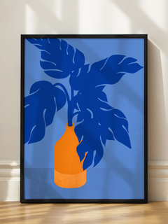 Dieses Poster zeigt ein stilisiertes blaues Blatt, das in einer leuchtend orangefarbenen Vase steht. Der Hintergrund ist in einem harmonischen Blauton gehalten, der das botanische Motiv hervorhebt. Die kräftigen Farben und die klare Komposition verleihen dem Bild eine moderne und frische Ausstrahlung, die sich perfekt in zeitgenössische Wohnräume einfügt.